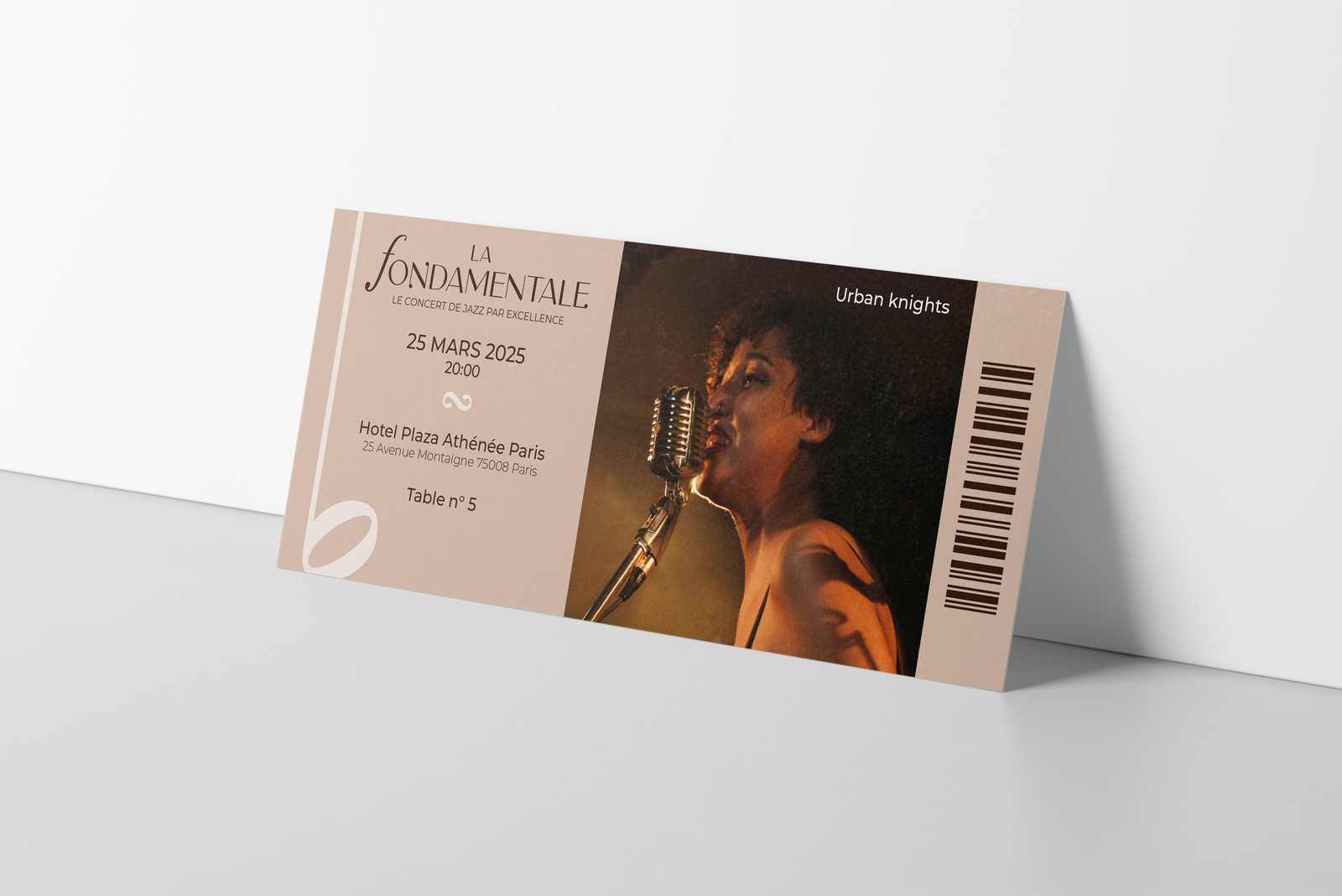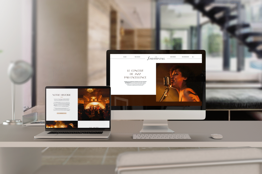 Inspirée des codes du luxe et du jazz, l’identité visuelle repose sur une palette intemporelle (marron profond, beige doré, blanc pur, noir intense), une typographie élégante (Carla Sans et Montserrat), et des marqueurs graphiques issus des partitions musicales (croches, points, symboles).